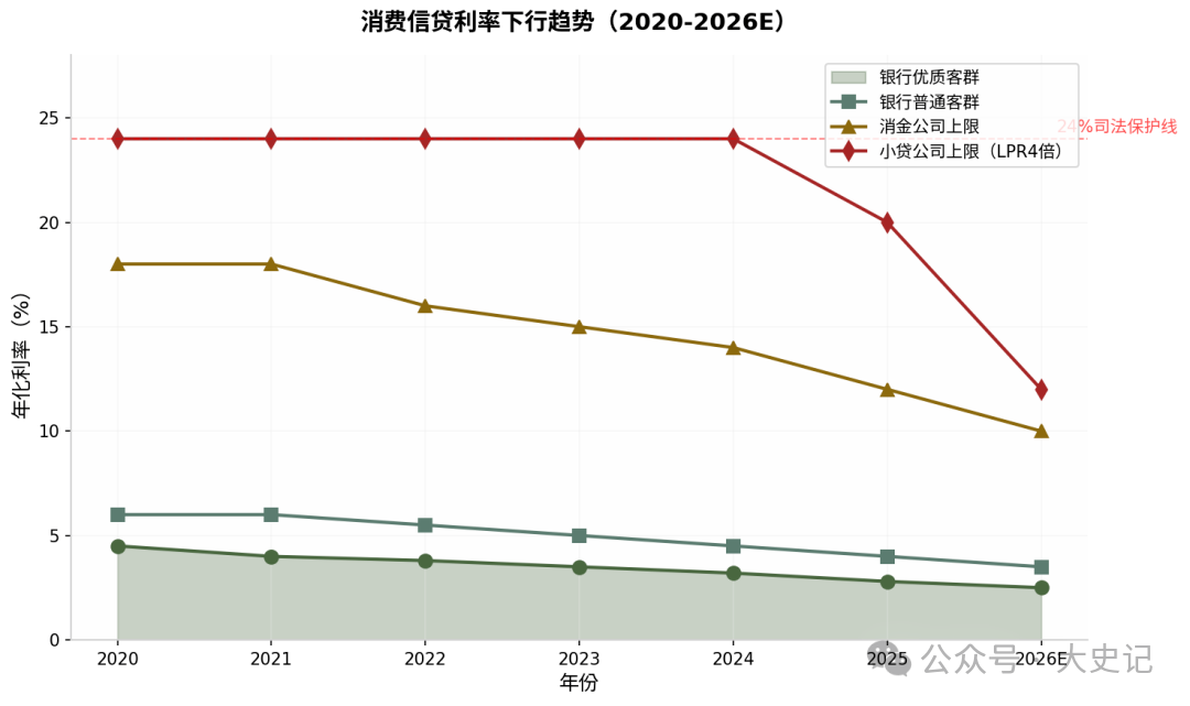 1.1利率下行不可逆:从24%司法保护上限到20%窗口指导,再到LPR4倍(12%)的小贷新规,利率天花板持续下移。银行优质客群利率已压至2.5%-3.5%,消费贷进入"微利时代"。