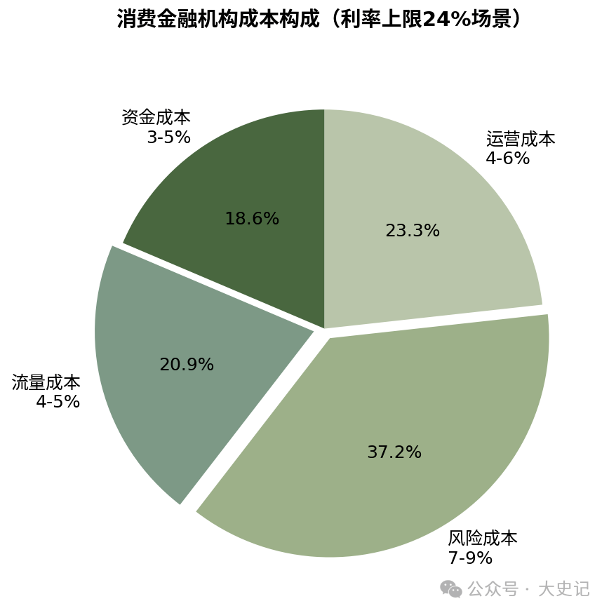 据行业估算,当前消费金融机构的成本构成大致为:资金成本约3%-5%,流量成本4%-5%,风险成本7%-9%,运营成本4%-6%。在利率上限24%的场景下,各项成本合计约18%-25%,利润空间仅约2%-3%。