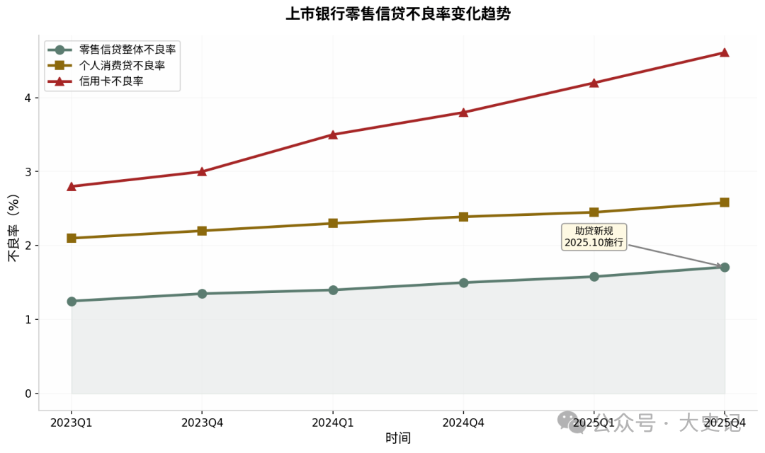 经济偏弱、共债高企,不良率持续上行。根据已披露的22家上市银行2025年年报数据:零售信贷不良率较年初上升0.24个百分点至1.71%,其中信用卡不良率上升0.12个百分点,消费贷不良率上升0.10个百分点。