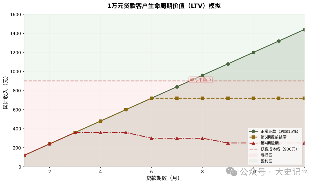 上图清晰展示了三种情景下的LTV差异:正常还款可在第8期突破盈亏平衡点;提前结清在第6期后收入不再增长,永远无法覆盖900元的获客成本;逾期情景下不仅无法盈利,还可能面临本金损失。