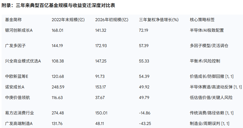 在科技股起舞的同时,另一面是部分传统赛道百亿巨头的落寞。这三年的周期洗牌,暴露出部分基金在面对宏观变迁时的“反应迟钝”与“路径依赖”。