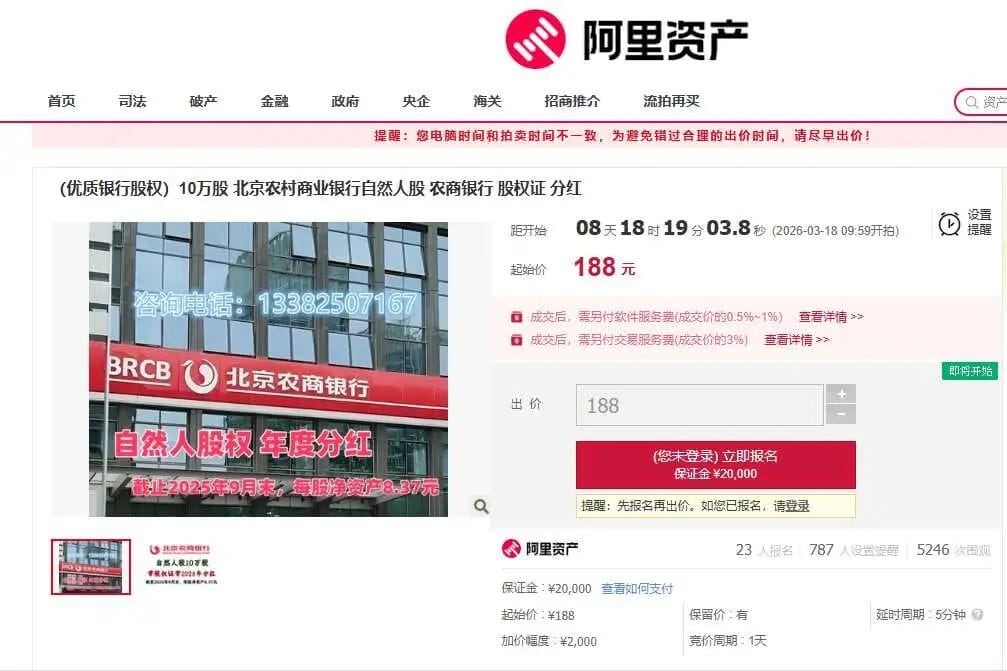 据阿里资产拍卖平台显示,有多笔北京农商行股权于近期拍卖,其中两笔股权均为自然人股10万股,起拍价仅1888元和188元。