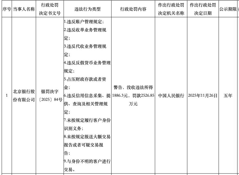 2025年11月底,北京银行因违反账户管理、反洗钱不力等九项问题,再次被罚款超2500万元,