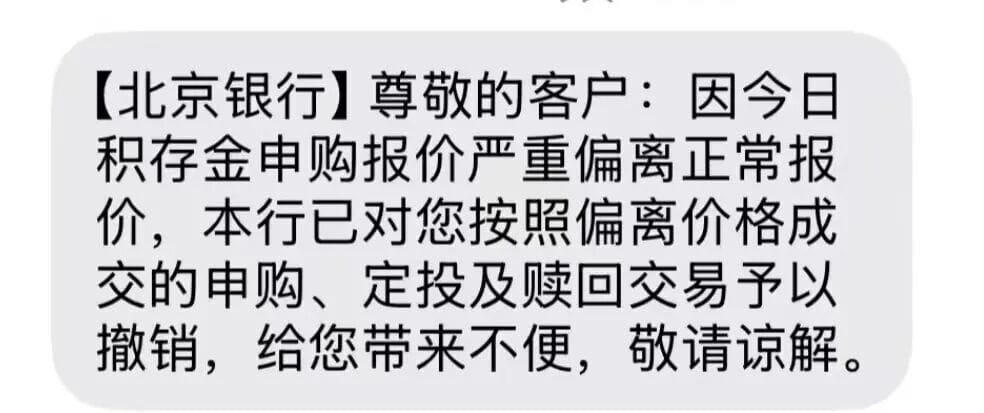 晚间,银行向所有参与异常交易的客户发送短信,单方面宣布撤销当日所有积存金交易,包括定投和赎回操作。