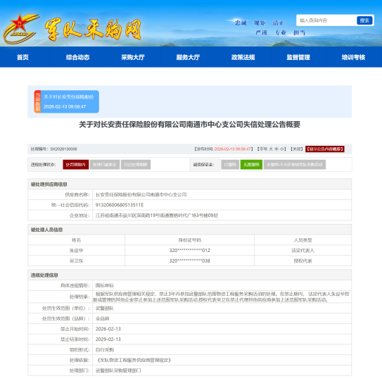 近日,军队采购网发布公告称,长安责任保险股份有限公司南通市中心支公司因被认定存在“围标串标”的违规情形,武警部队采购管理部门根据《军队物资工程服务供应商管理规定》相关规定,禁止该公司自2026年2月13日起3年内参加武警部队范围物资工程服务采购活动。