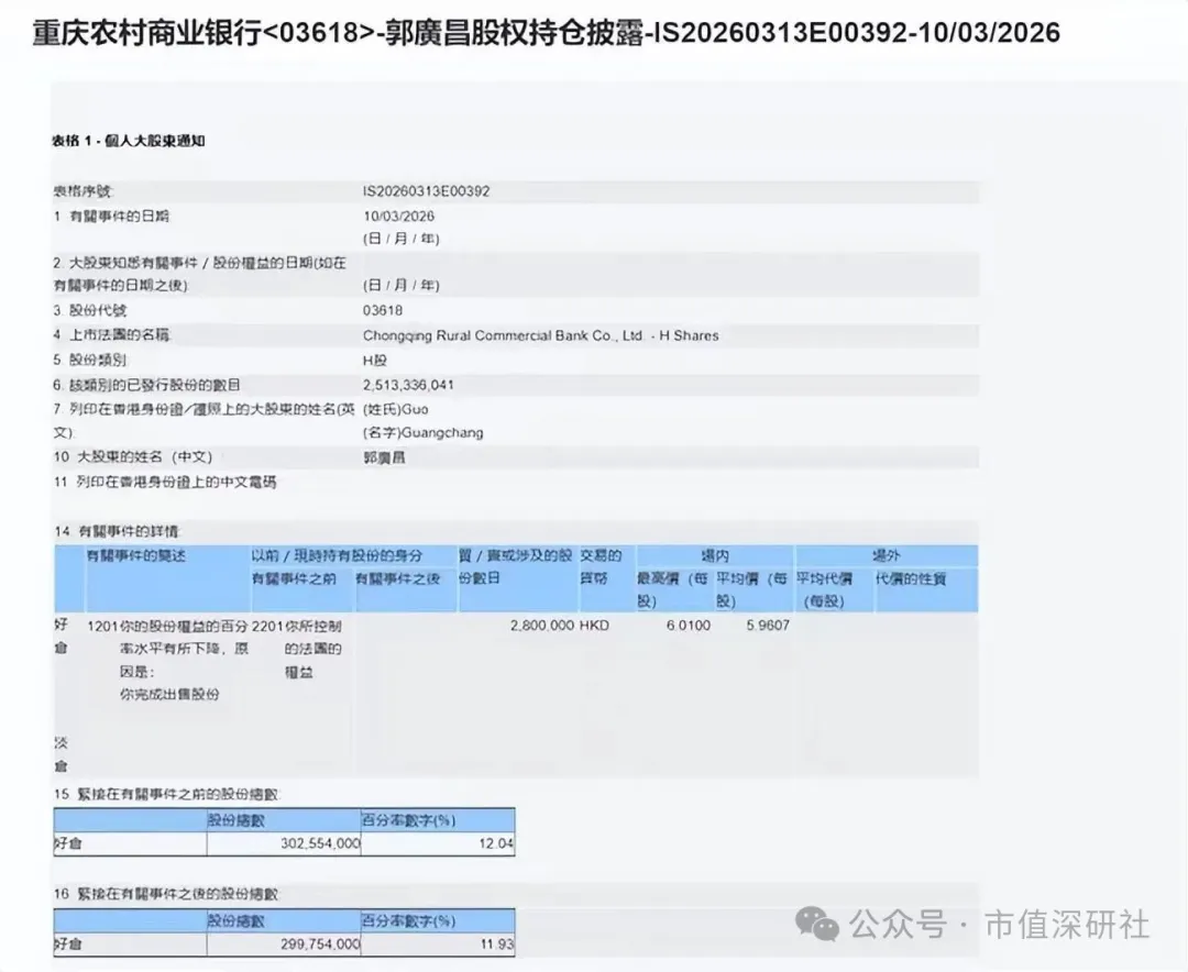 3月16日,Wind数据显示,郭广昌于3月10日减持重庆农商银行H股280万股,成交均价约5.96港元,套现约1669万港元。减持后,其持股数量由约3.03亿股降至约3亿股,持股比例从12.04%小幅降至11.93%。