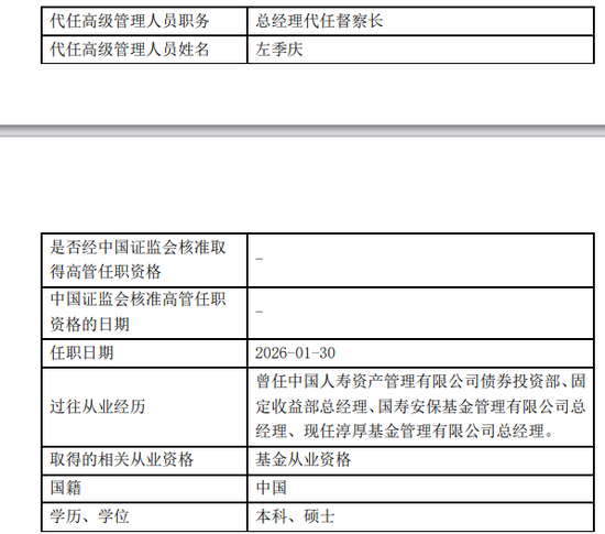 前督察长沈志婷也被免职,由总经理左季庆代任督察长。沈志婷曾先后任职于信诚基金管理有限公司、国泰基金、财通基金、淳厚基金监察稽核部。2023年4月18日起担任淳厚基金督察长,截至其离任前,在公司任职2年10个月。