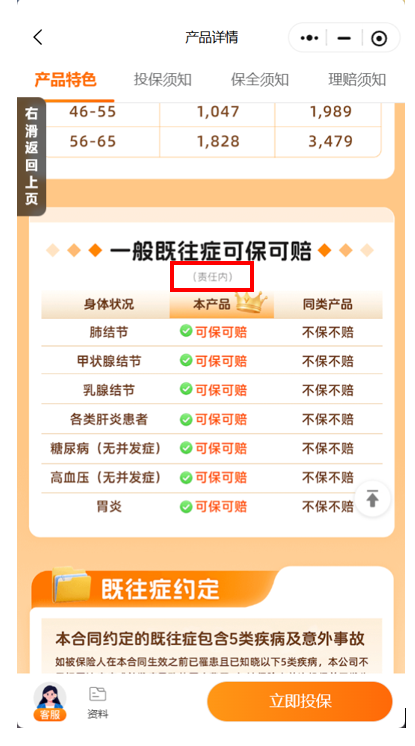 手段在于——大字诱导“一般既往症可保可赔”给人的第一直觉是,无论投保前患有何种慢性病,出险后均能获得赔付。再通过小字设限 “责任内”三字实际上指向了长达数页的合同条款,其中可能包含了对特定严重疾病、遗传性疾病或未如实告知的特定情景的严格剔除。