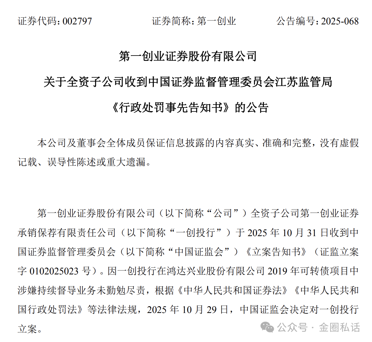 2025年12月5日,第一创业全资子公司一创投行收到江苏证监局《行政处罚事先告知书》。监管认定,其在鸿达兴业可转债项目持续督导过程中未勤勉尽责。最终,一创投行被没收保荐业务收入424.53万元,并处以1273.58万元罚款,合计罚没约1700万元。