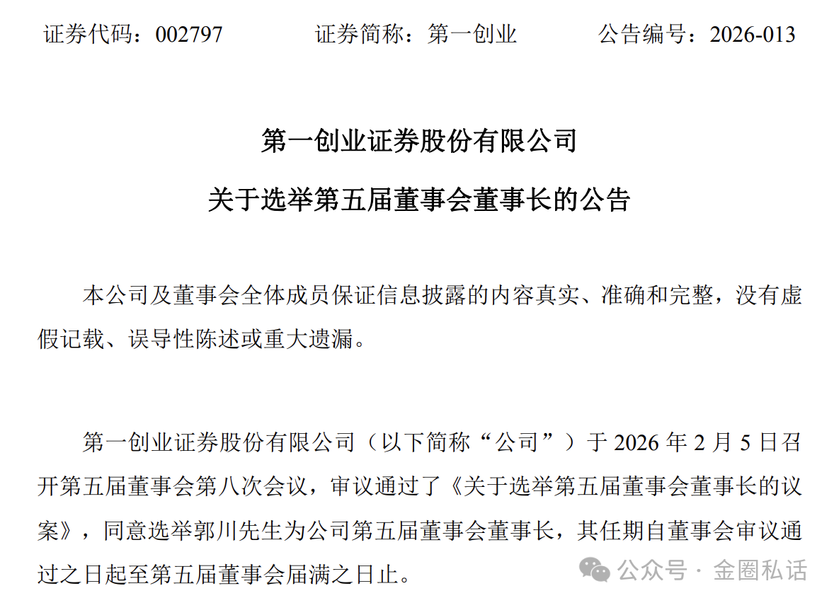 2026年2月5日盘后,第一创业公告称,选举郭川为公司第五届董事会董事长。至此,这家上市券商自2025年7月原董事长吴礼顺离任以来的“掌门人真空期”正式结束。
