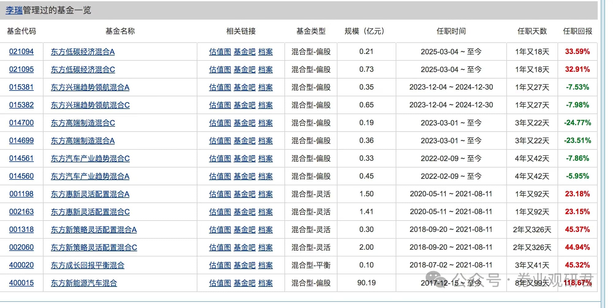 业绩层面,李瑞管理的产品分化明显。其代表作东方新能源汽车混合虽长期任职回报达118.67%,但2022年至2025年合计利润亏损达90.55亿元,管理规模也从峰值持续缩水;东方汽车产业趋势A自2022年成立以来总回报亏5.95%,跑输业绩比较基准超15个百分点,规模从首募2.68亿元降至0.45亿元;东方高端制造A任职回报为-23.51%,自成立以来已发布13份清盘风险提示公告,两次召开持有人大会修改基金合同终止条款才得以存续。