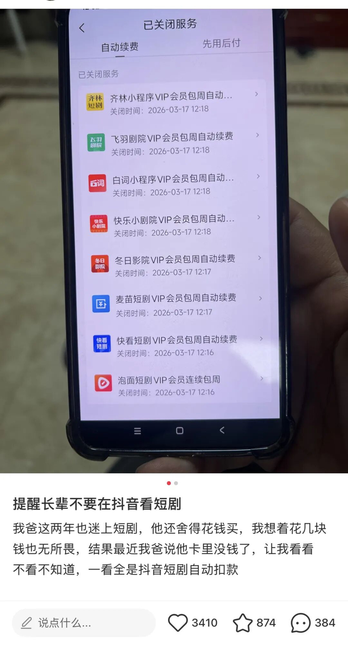 小红书上一名网友最近发帖称,自己父亲在抖音平台看剧,被开通了19个周扣付款小程序,每个月扣80块,一个月因为看短剧被扣一两千。