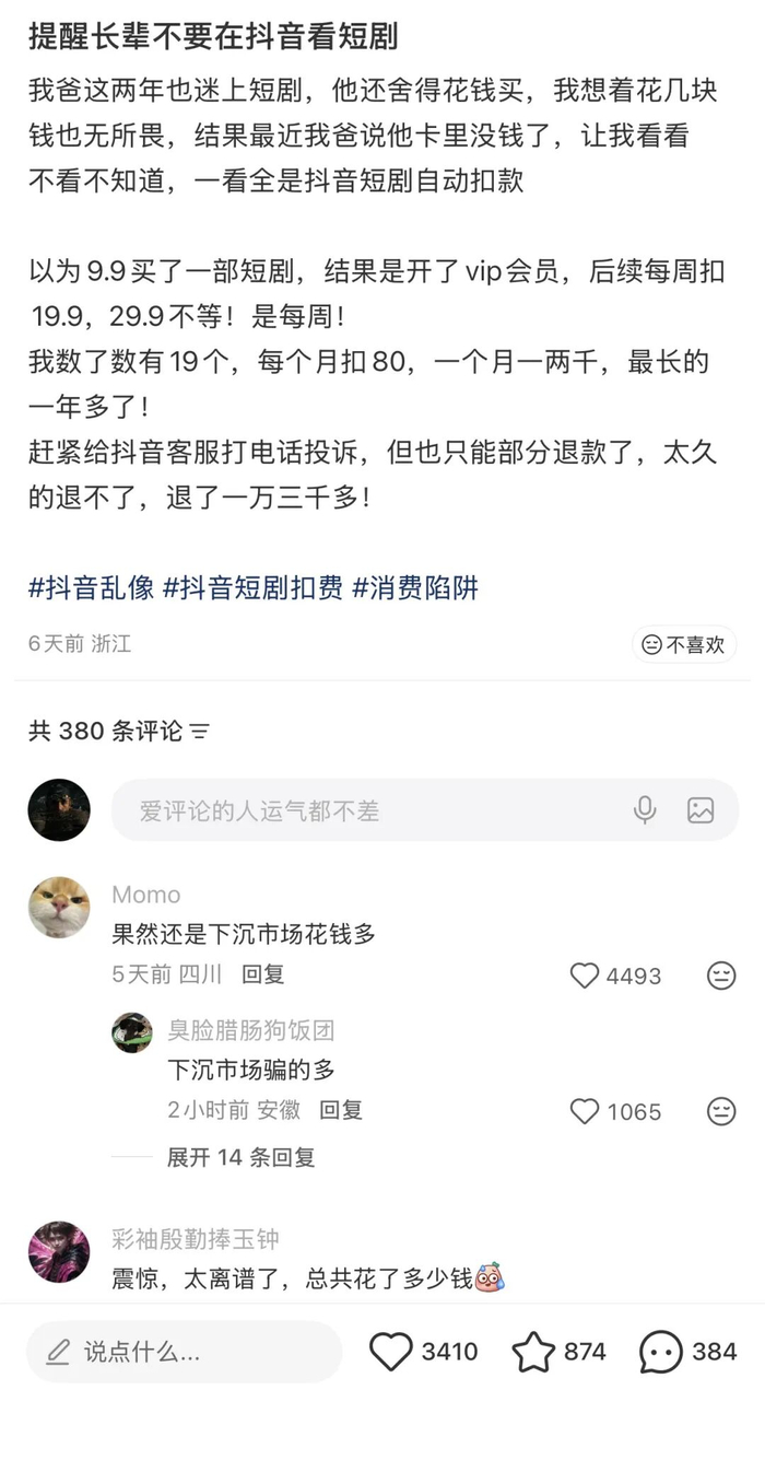 「我妈不认识字,抖音短剧被扣了两百多块钱,没有让输密码啥的,就自动扣费了,找客服说退不了,让我去找商家,不知道哪里找商家,现在老年人被这样扣钱的真不少,哪里能退啊。」