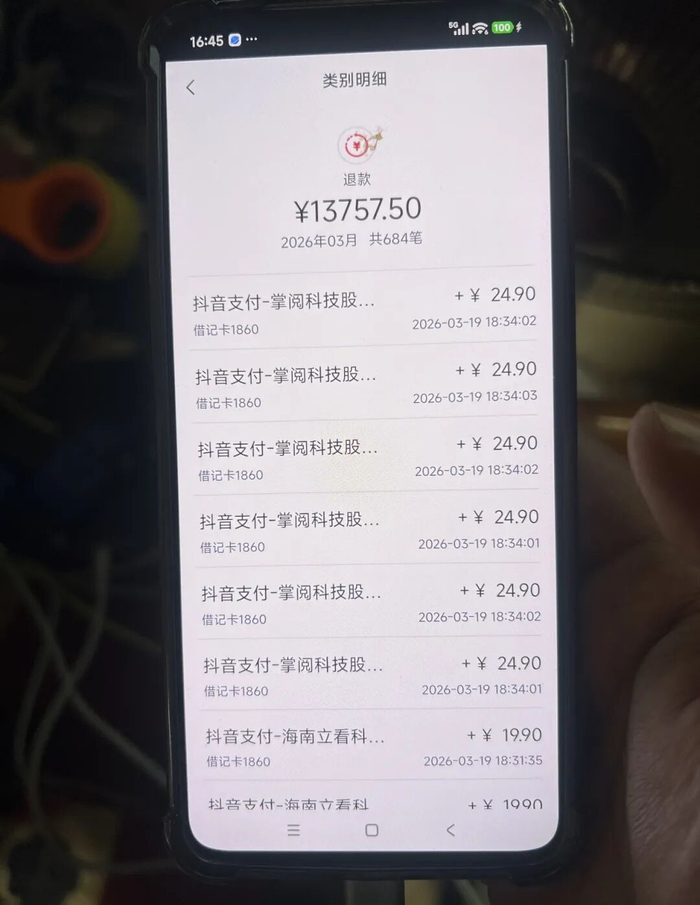 直到自己父亲说卡里没钱了,才引起本人注意,不看不知道,一看吓一跳,赶紧联系抖音客服退款,但有的时间久远,已无法退款。