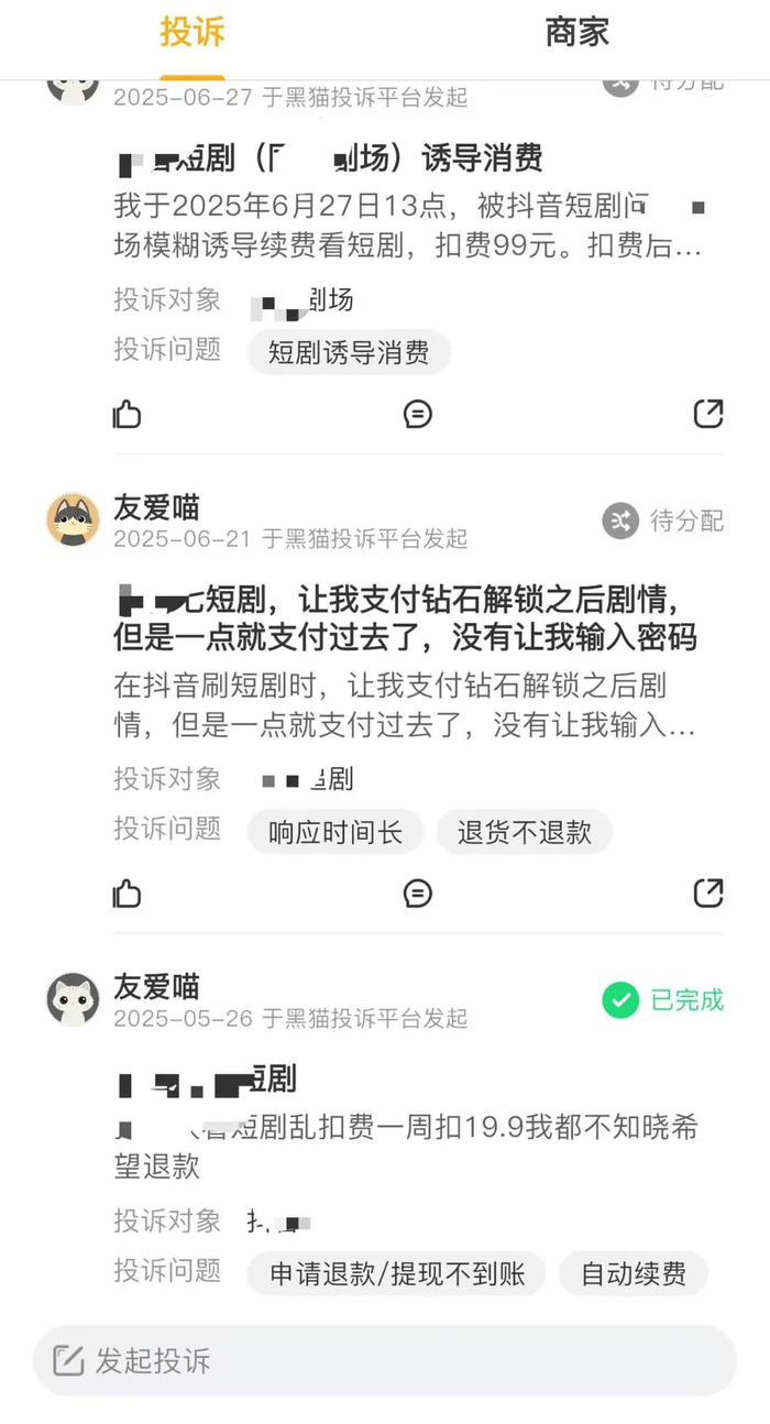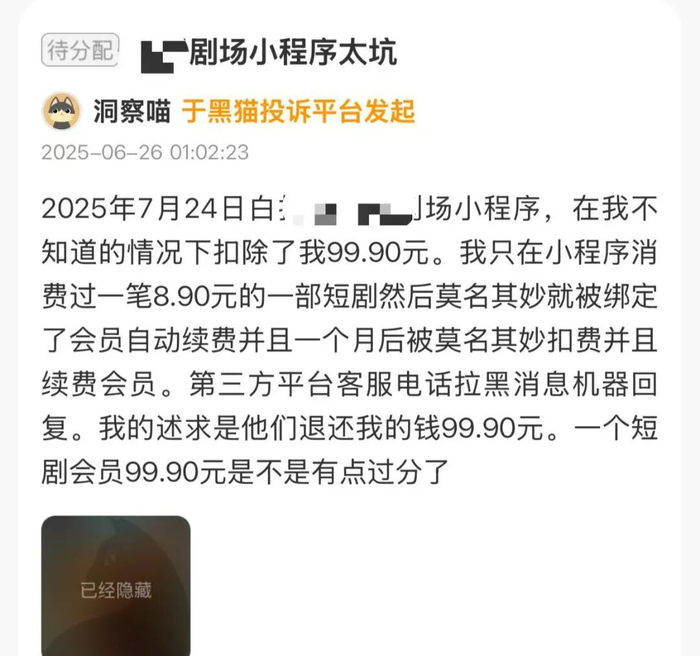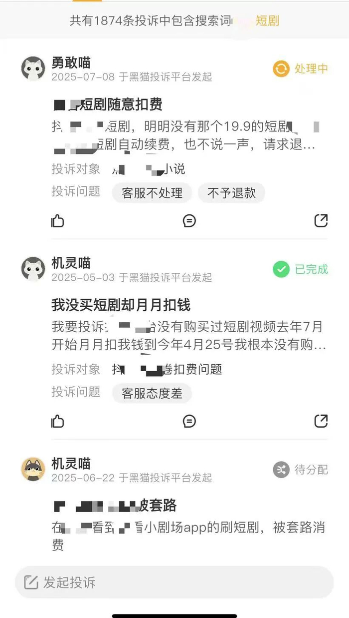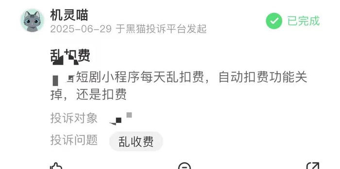 最近一段时间,小红书、主站、黑猫等平台上,陆续出现不少短剧小程序的扣费乱象相关的投诉。