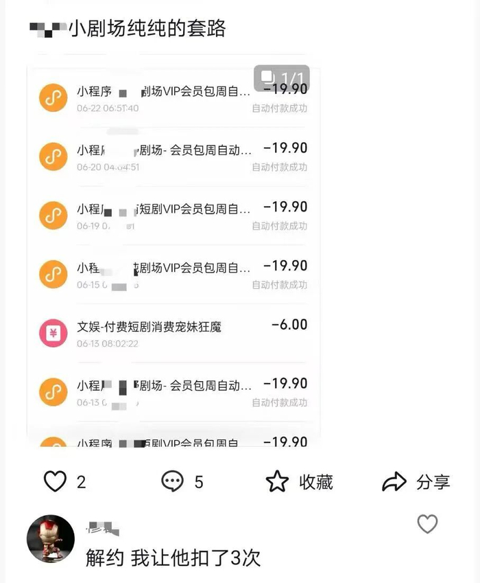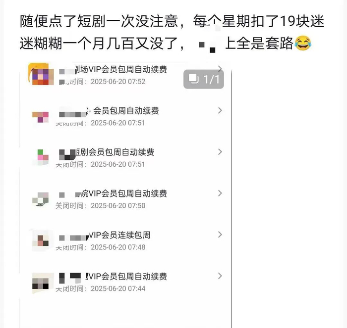 「随便点了短剧一次没注意,每个星期扣了19块,迷迷糊糊一个月几百又没了,主站上全是套路。」