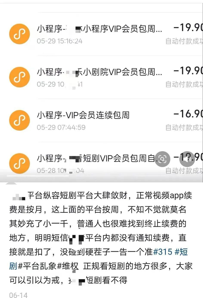 各个平台上,在主站消费过短剧的用户,对短剧消费体验的评价如出一辙。接连指出平台上存在的短剧自动续费乱象。