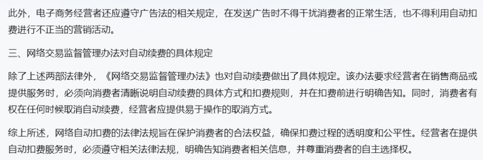 在《网络交易监督管理办法》中,同样对自动续费做了具体规定,要求经营者在销售商品或提供服务时,必须向消费者清晰说明自动续费的具体方式和扣费规则,并在扣费前进行明确告知。