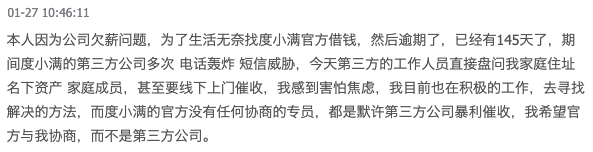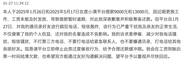 一名用户在1月27日投诉称,亲友遭到度小满的电话和短信骚扰:“本人于2025年1月26日和2025年5月17日在度小满平台借款9000元和13000元,因近期更换工作,工资未能及时发放,导致借款暂时逾期,对此我深表歉意并积极筹备还款。但平台自1月27日,对我的通讯录好友进行疯狂电话、短信轰炸,该行为已严重干扰我及亲友的正常生活,不仅侵害了我的个人权益,还对我的名誉造成不良影响。我的诉求是停催,减少对我电话骚扰、短信骚扰,不打第三方电话,不要打电话给紧急联系人,也不要爆通讯录,打电话给其他亲朋好友。现恳请平台立即停止此类过度催收行为,给予合理还款缓冲期。我会在工资到账后第一时间结清欠款,也希望双方能通过友好沟通解决问题,望平台予以重视并尽快回应。”