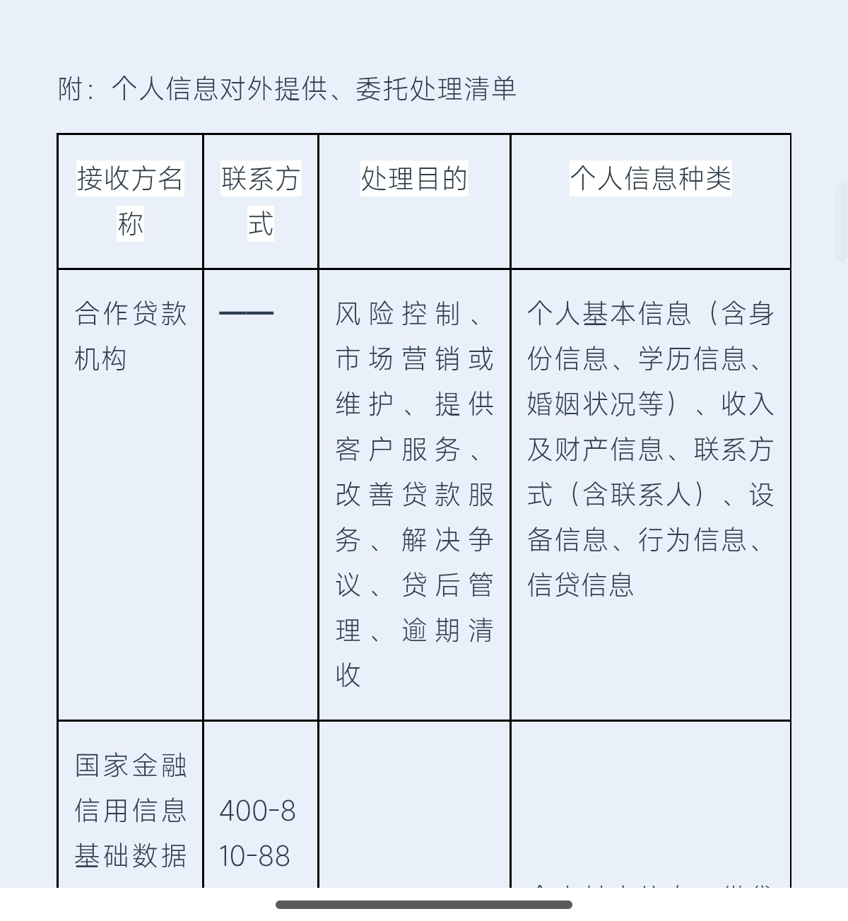 《个人信息授权书》的附件,是“个人信息对外提供、委托处理清单”,设置接收方名称、联系方式、处理目的和个人信息种类四个类目。其中,征信机构等接收方均完整具名,而以“风险控制、市场营销、客户服务、贷后管理、逾期清收” 为处理目的的接收方,仅模糊标注为“合作贷款机构”,联系方式栏显示为“—”。