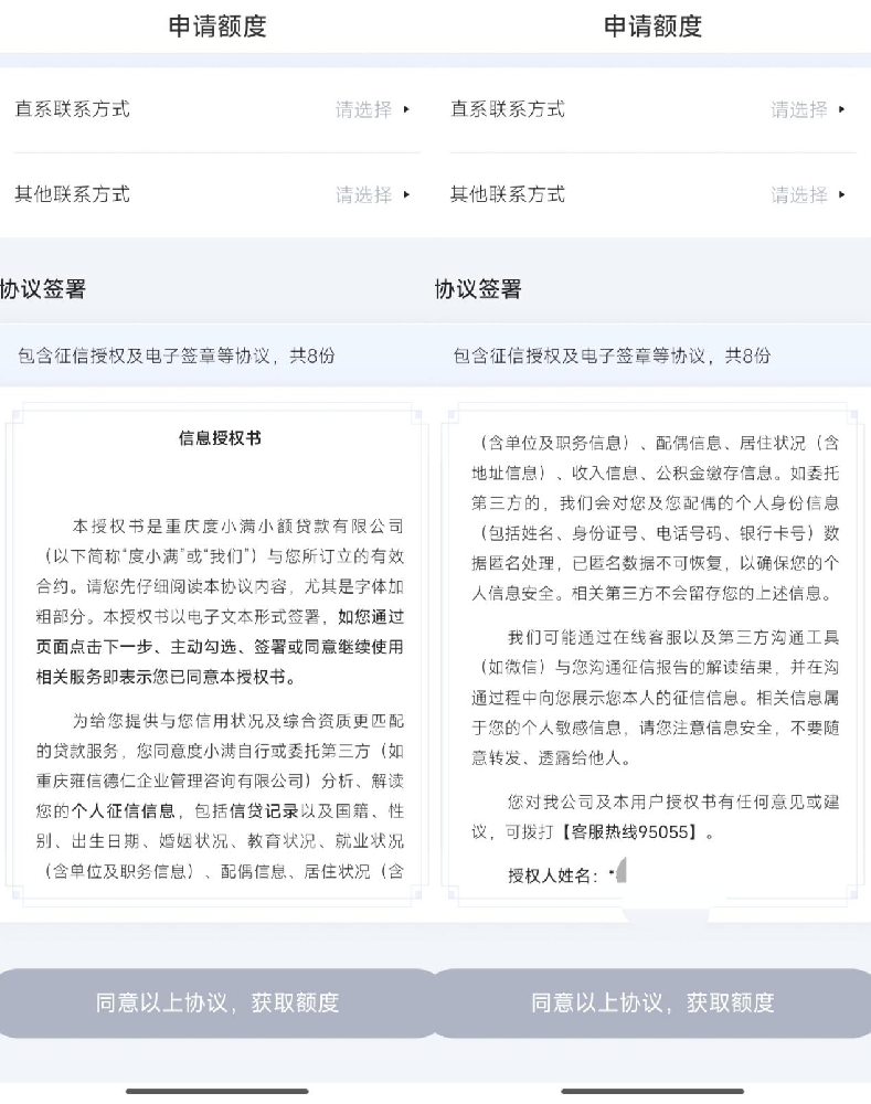 完成实名认证并人脸识别后,申请额度还需完善包括“职业收入”“其他联系方式”等个人信息,并签署8份协议,其中包含2份《个人征信授权书》(分别授权重庆度小满小贷、度小满小贷贷款合作机构),1份《信息授权书》以及前面出现过的《个人信息保护政策》《个人信息授权书》等。