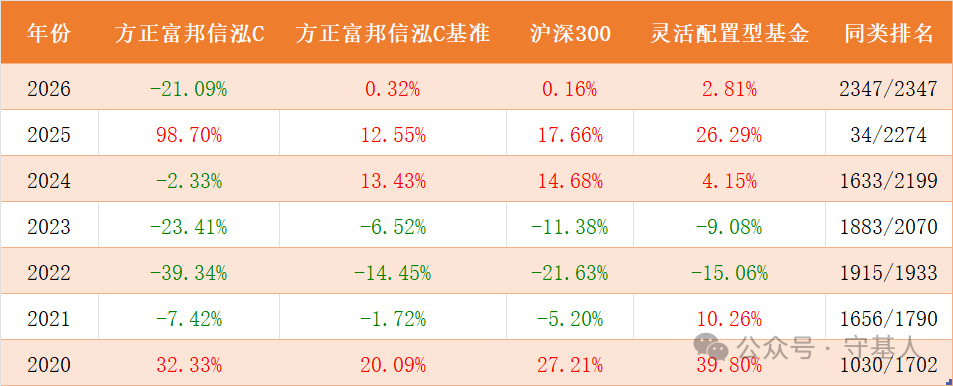 从业绩曲线看,方正富邦信泓混合在2020年表现尚可,但2021-2024年连续四年大幅跑输基准和同类,尤其在2022年几乎垫底;2025年奇迹般翻身,收益接近100%,排名跃居前2%;而2026年初再度陷入深渊,排名倒数第一。