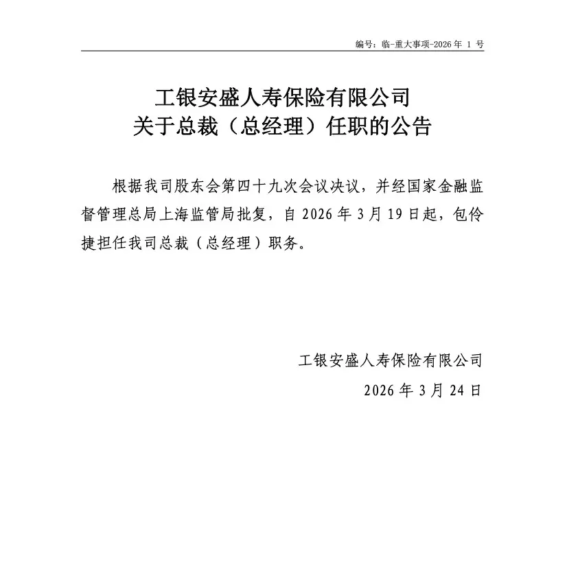 “3月24日,工银安盛人寿保险有限公司发布总裁任职公告,明确经公司股东会第四十九次会议决议及国家金融监督管理总局上海监管局批复,自2026年3月19日起,包伶捷正式出任公司总裁(总经理)职务,同时兼任首席合规官。”