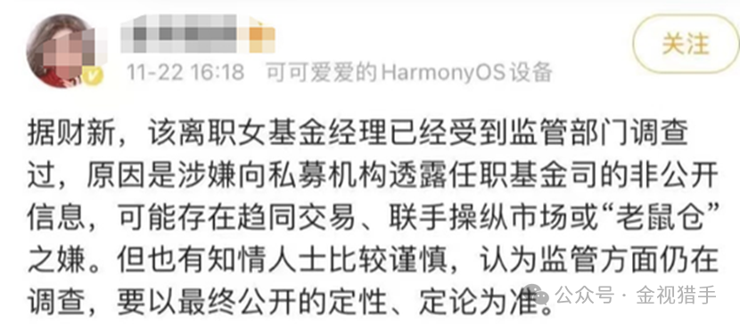 起初,市场将其离职解读为“奔私”——这是明星经理的常规职业路径,甚至有传闻称她“身价太高,公募已无力挽留”。但随着舆论发酵,更惊悚的版本开始流传:社交平台上“被拷走”的截图,将她的离职与监管调查直接绑定。