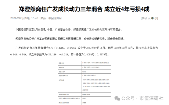 3月18日,广发基金公告,郑澄然因工作安排,正式卸任广发成长动力三年持有期混合基金经理,该产品由苏文杰单独接管。Wind数据显示,郑澄然自2022年7月发起设立该基金以来,任期内亏损39.11%,跑输基准56.32个百分点。