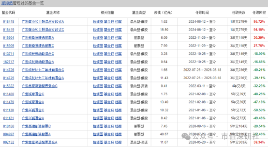 目前,郑澄然旗下多只产品已进入“被接管”模式。广发兴诚混合A、广发诚享混合A任职回报分别-49.46%、-47.18%,2025年10月分别增聘刘彬、叶帅等共管;广发高端制造(其最大产品)任职回报-22.46%,规模从2021年末182.45亿元缩至48.11亿元,2021-2025上半年累计亏损83.7亿元。近半年,3只亏损近40%的产品相继被他人接手或共管,郑澄然单独管理的产品仅剩4只。