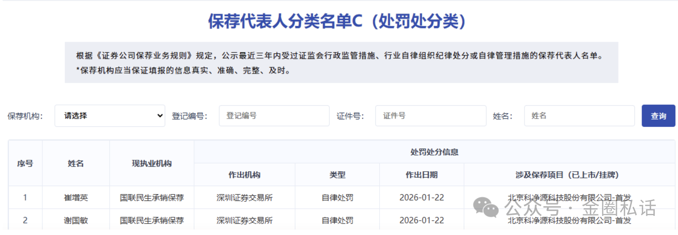 中国证券业协会官网公示信息显示,2026年1月22日,深交所对谢国敏、崔增英采取自律监管措施,两人进入《保荐代表人分类名单C(处罚处分类)》。此前的2025年11月28日,曹冬、曹文轩因在项目执业过程中存在核查不到位等问题,被深交所约见谈话,同样进入名单C。更早之前,2025年9月9日,金亚平因长期违规买卖股票被证监会行政处罚,进入《保荐代表人分类名单D(暂停业务类)》。