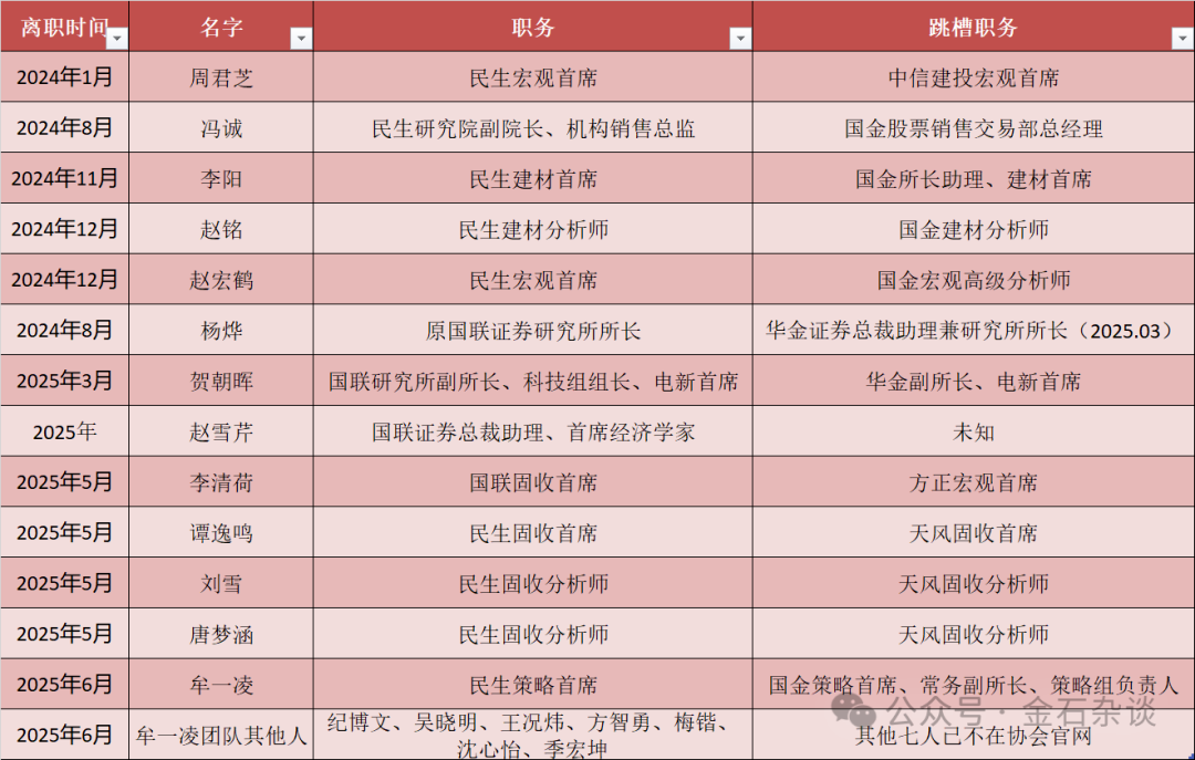 此前金石随笔曾做过报道,随着国联民生合并,国联研究所和民生研究所上演离职潮,去年6月金石杂谈曾制图,国联民生分析师们集体离职,其中民生研究所既有宏观首席,也有固收首席,还有策略首席,甚至固收首席和策略首席等团队组团离职。