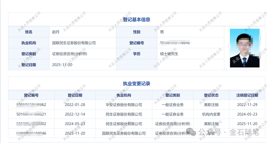 金石随笔查询发现,原民生研究所分析师跳槽情况确实挺严重,凡是2024年以前的民生分析师全部跳槽,国联证券背景的分析师成为国联民生研究所主流。不过,也有部分民生分析师依然在职。