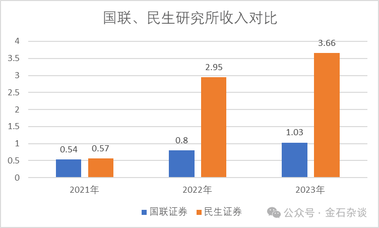 不曾想合并一年后,研究所实力更强的民生证券受伤最大。比如2023年,民生证券研究所收入17名,而国联证券只有38名。民生证券收入高达3.66亿,而国联证券只有1.03亿,民生证券是国联的3.5倍。