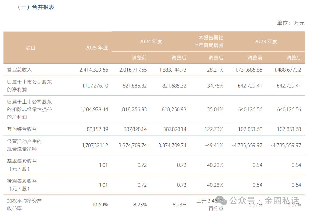 2025年,国信证券实现营业收入241.43亿元,同比增长28.21%;归母净利润110.73亿元,同比增长34.76%;扣非净利润110.50亿元,同比增长35.04%。