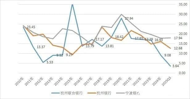 图:杭州联合银行与杭州银行、宁波银行贷款增速一览