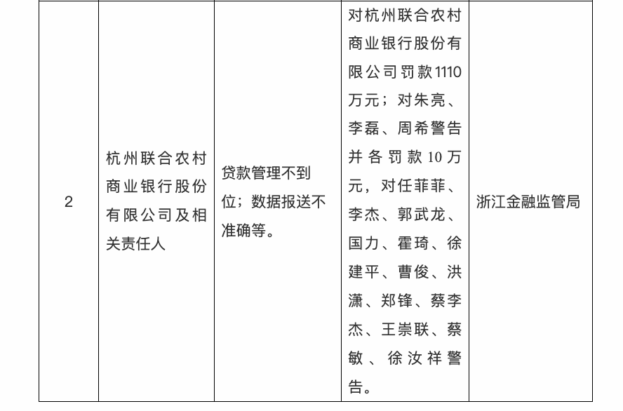 上周,杭州联合银行因贷款管理不到位、数据报送不准确等违规事实,被处以1110万元罚款,同时16名相关责任人被追责,其中3人各被罚款10万元。