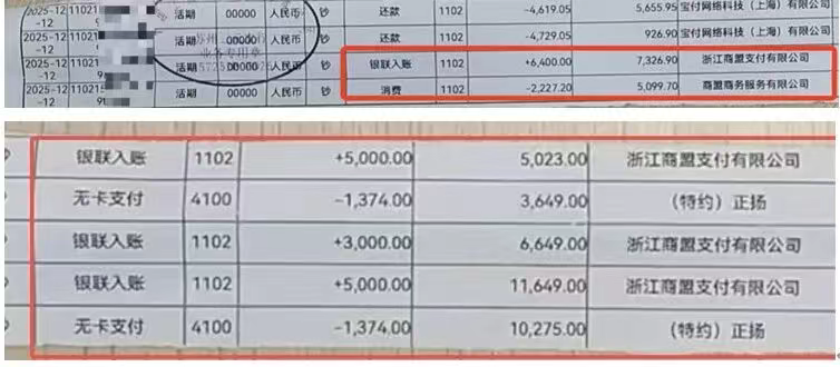 小范介绍,2025年12月12日他还在同一平台另两个贷款品牌处分别贷款5000元,到账后当天分别被扣走了1374元的“砍头息”。打款的账户也是浙江商盟支付有限公司,扣款方均是特约正杨。