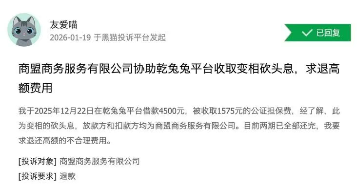 投诉信息显示,浙江商盟支付有限公司是多个网贷平台的打款方,同时也是“砍头息”的扣款方,扣费的名目包括公证费、担保费、商品费、会员费等。这些平台的还款周期普遍较短,为30天左右,明面利息在24%红线之内,但会一次性收取千余元的“担保费”,从而将实际借款年化利率推高至400%。