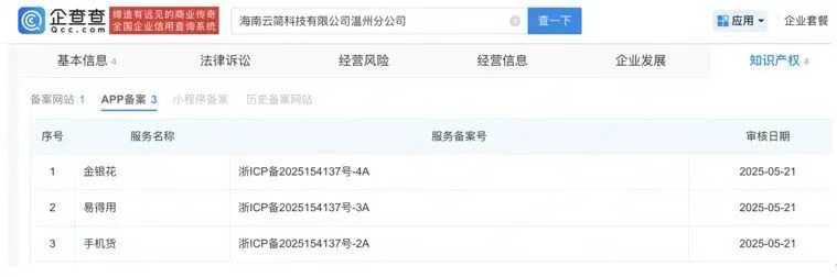 企查查显示,2025年5月21日,海南云简科技有限公司温州分公司备案了“金银花”App,以及“易得用”“手机贷”等网贷品牌,而海南云简科技的大股东为鸿源小贷,持股51%。