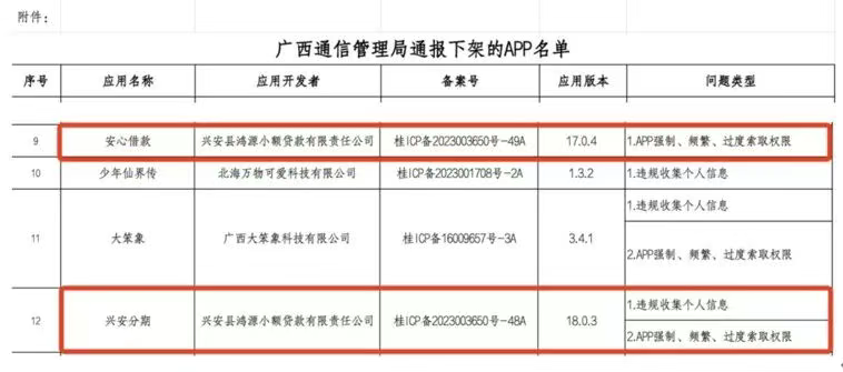 通报显示,“安心借款”所涉问题为“APP强制、频繁、过度索取权限”;“兴安分期”所涉问题为“违规收集个人信息、APP强制、频繁、过度索取权限”两项。