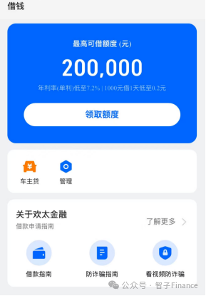 打开APP首页“借钱”板块,平台对外高调宣传“最高可借20万元、年利率最低7.2%”,用低息、快贷、高额度的话术吸引用户。
