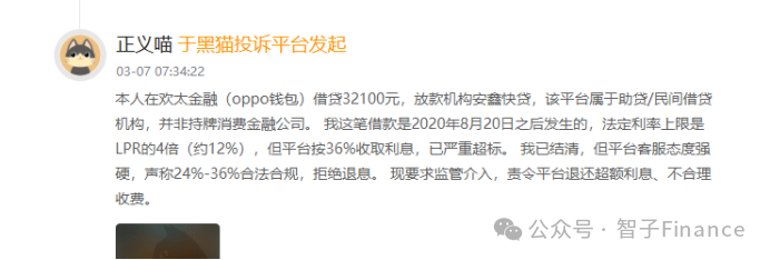 另有用户投诉称,其于2024年12月24日通过欢太金融平台申请借款4700元,实际放款方为新网银行,分12期还款,每月还款472.14元。按IRR方式计算,该笔贷款的综合年化利率约为35.99%,远超国家规定的利率上限。
