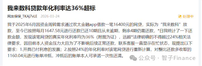 在“消保保”平台上,有用户投诉称,其于2025年6月因资金周转需求,通过欢太金融App借款16400元,实际放款方为“我来数科”。该用户已按每月1647.58元还款10期,从未逾期,剩余4期尚未结清。经统计,该笔贷款的真实年化利率达到36%。