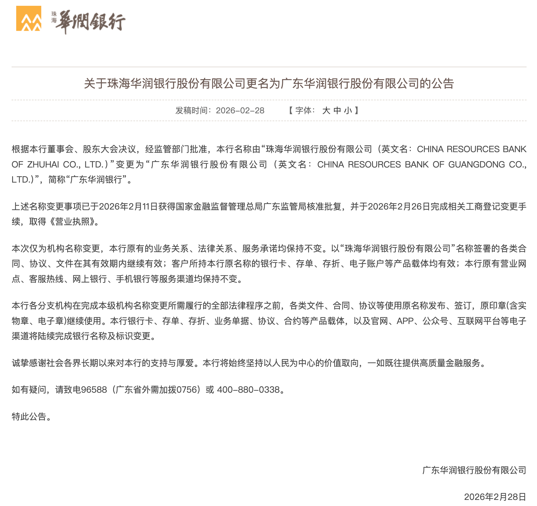 2026 年 2 月 28 日,华润银行正式官宣:珠海华润银行改名广东华润银行。