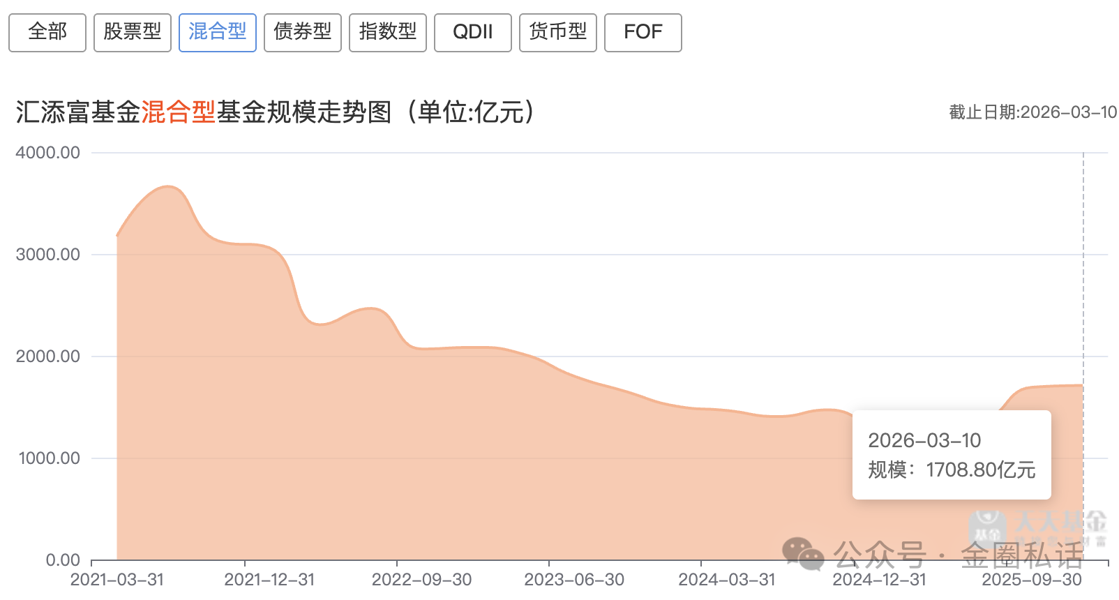 更关键的是主动权益板块的收缩。混合型基金规模从2021年6月的3413亿元高点降至2026年3月10日的1708.80亿元,规模缩水超过1700亿元,下滑明显;股票型基金规模曾由349.74亿元降至206.72亿元,缩水超过四成。