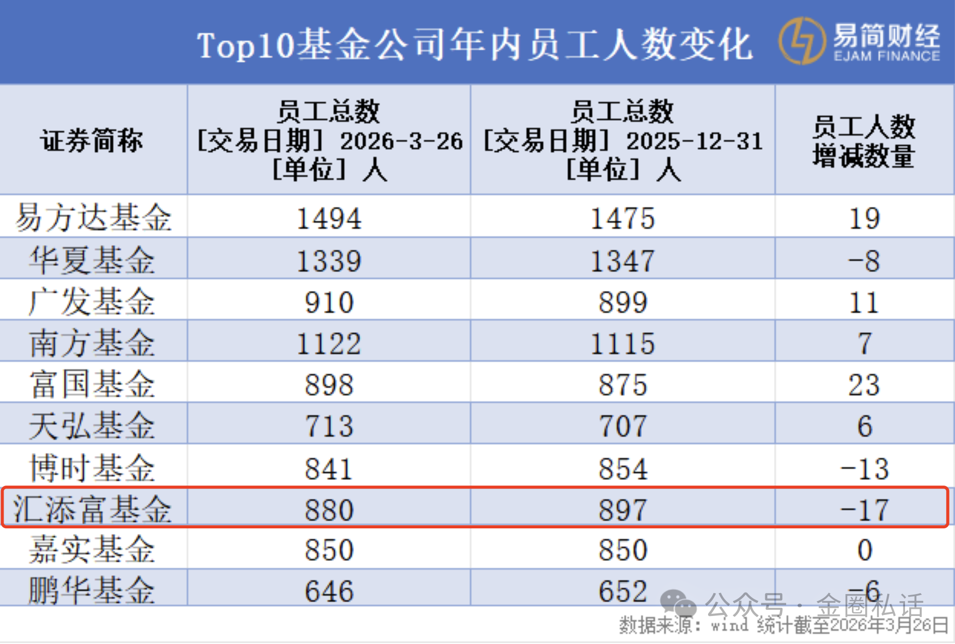 根据媒体统计,2月26日至3月19日期间,市场陆续传出公司出现16人集中离职,涉及投研与市场等核心岗位。从整体数据看,截至2025年底公司员工总数为897人,而至2026年3月26日已降至880人,不到三个月减少17人,在头部公募中属于相对明显的波动。