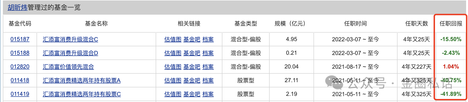 业绩端同样印证这一变化。部分代表性主动权益基金在中长期维度明显跑输基准。以胡昕炜管理的产品为例,其管理的汇添富消费精选两年持有股票A/C,成立以来的收益率分别为-40.75%、-41.89%;另一只汇添富消费升级混合C产品成立以来收益率也达到-15.50%。对于长期持有的投资者而言,亏损幅度最高超过四成。