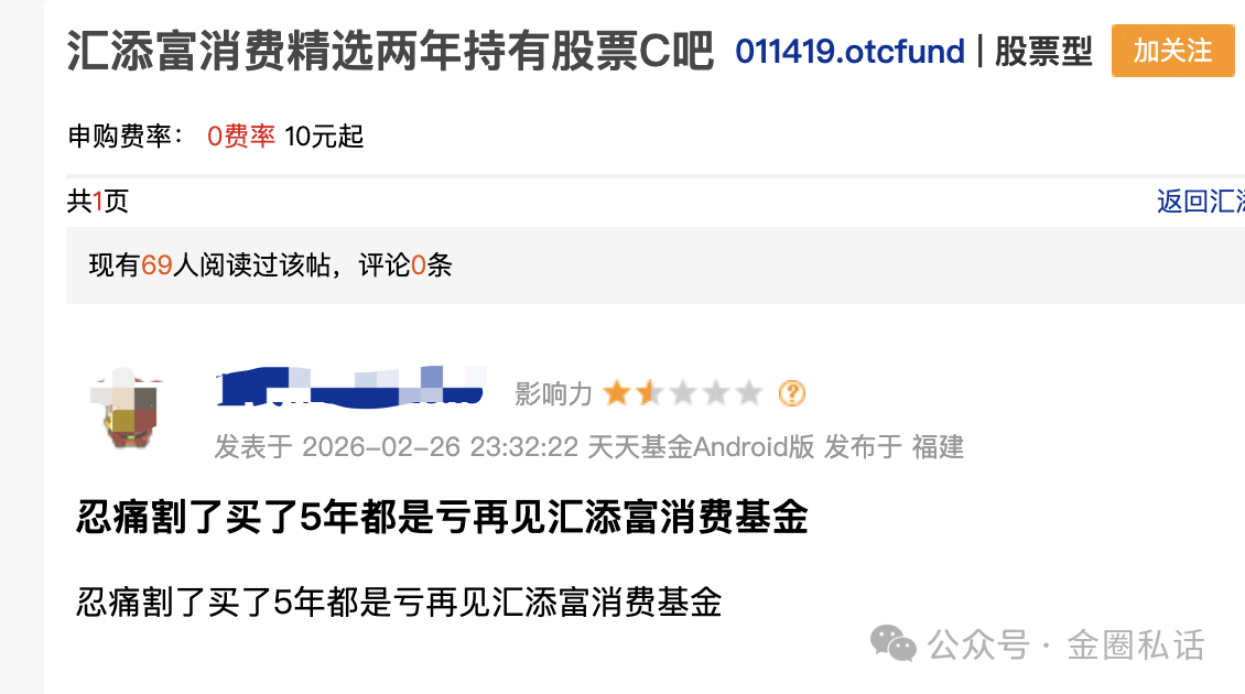 在产品论坛吧里,就有长持的基民忍痛割了买了5年都是亏损的汇添富消费精选两年持有股票C,长期的回撤让基民心寒离场。