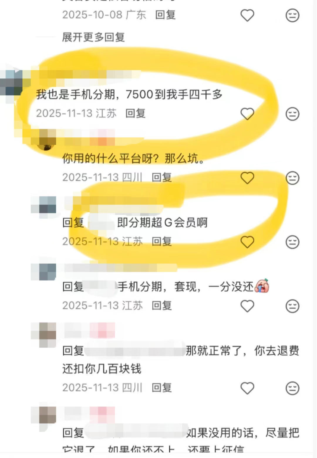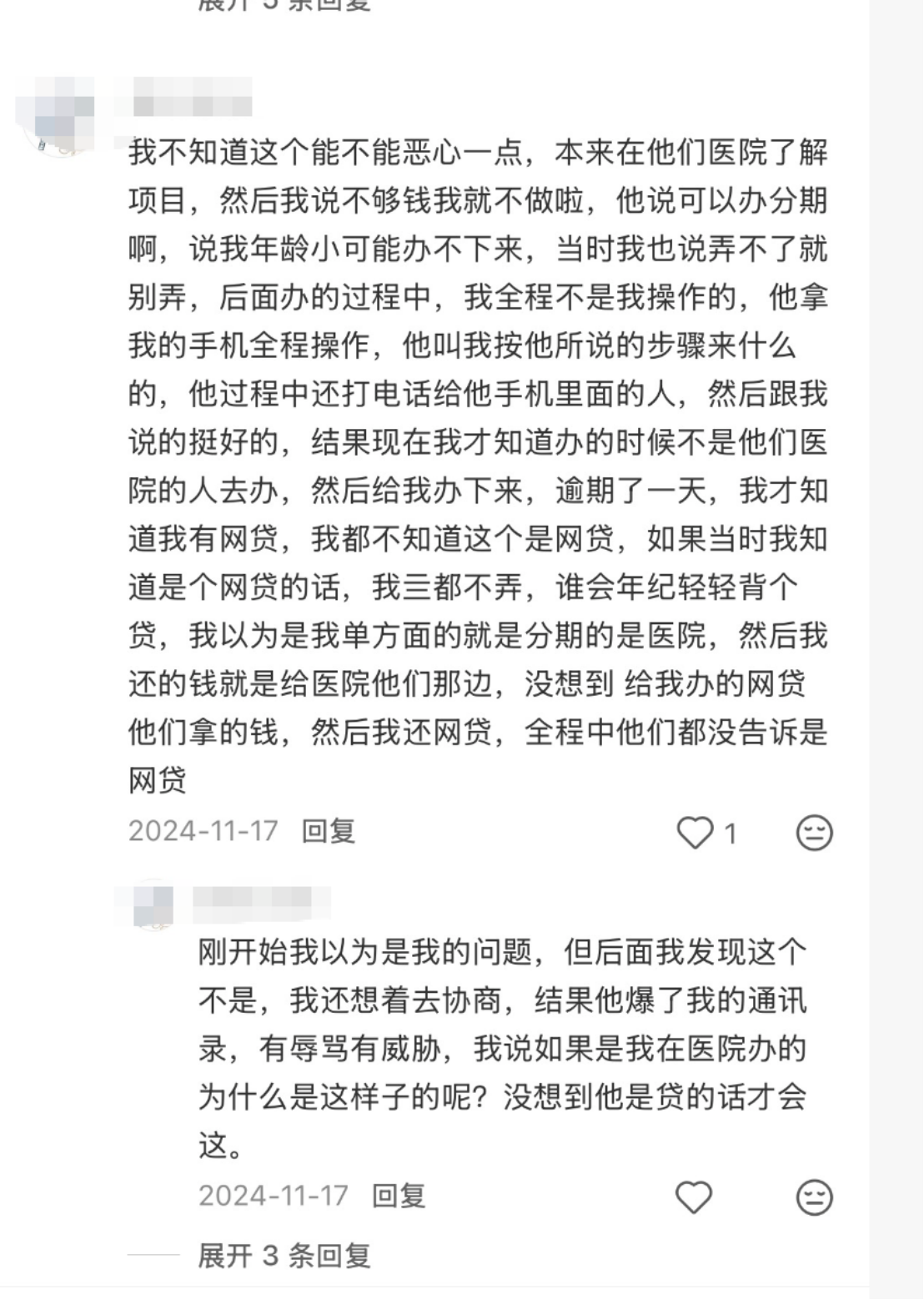 一用户称手机分期7500元,但实际到手只有4000多;另有用户称做美容时贷款2万多元,逾期之后,现在已增至9万多元;